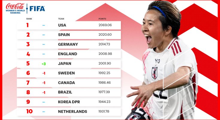 - Japan back in the top five, while the United States remain out in front despite SheBelieves Cup disappointment