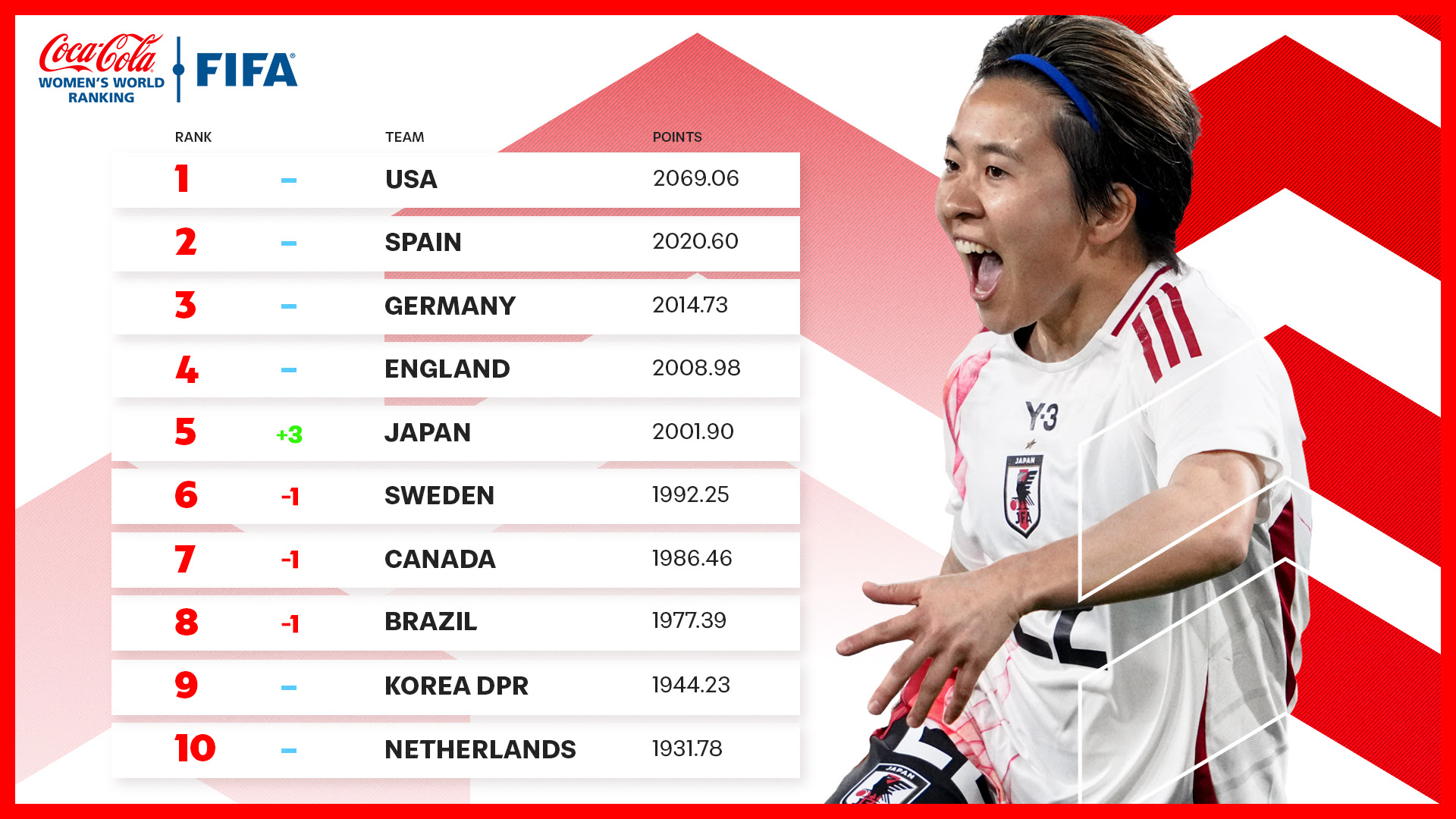 The next edition of the FIFA/Coca-Cola Women’s World Ranking will be published on 12 June 2025.