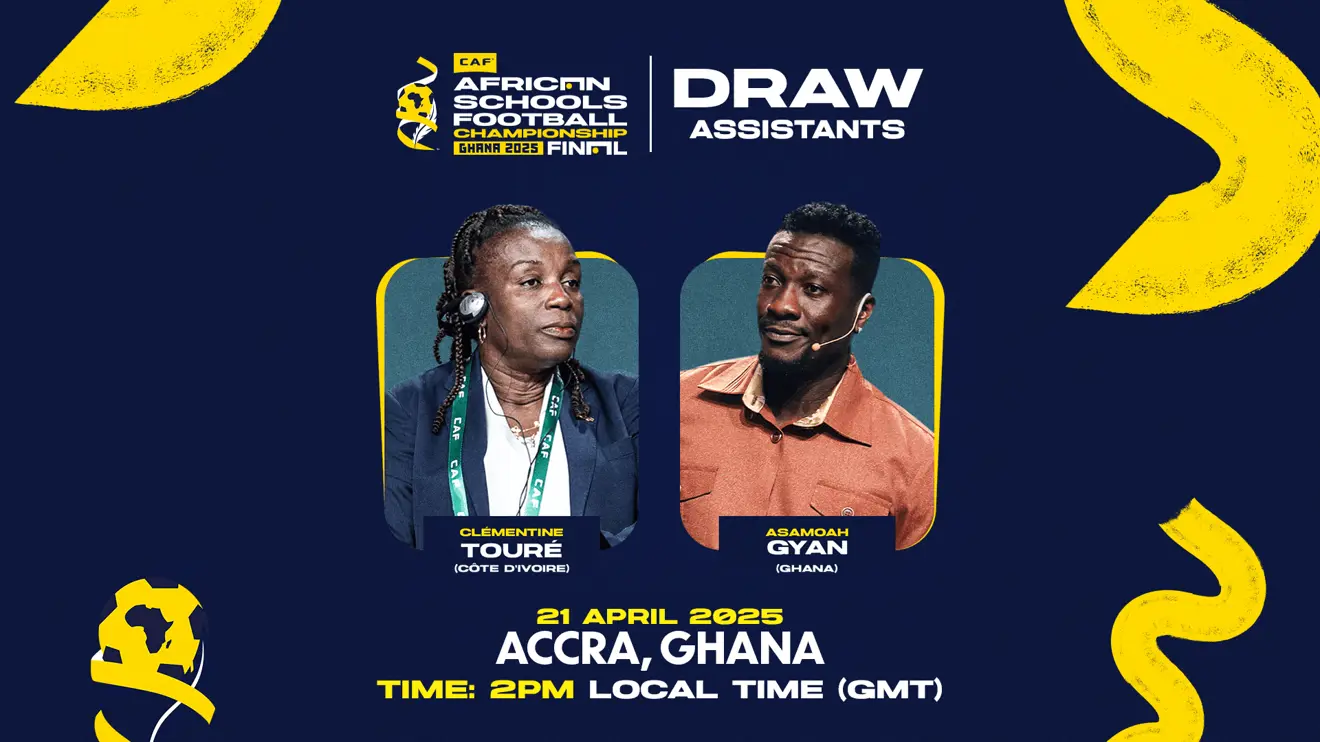 As excitement builds ahead of the much-anticipated CAF African Schools Football Championship Continental Finals in Ghana, CAF has confirmed African legends Asamoah Gyan and Clementine Toure as assistants for the Official Draw on Monday, 21 April at the MultiChoice offices in Accra at 14:00 local time / GMT.