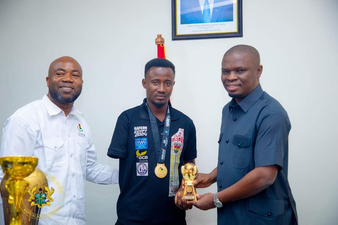 Sports Minister Mustapha Ussif received the trophies won by the Black Challenge, the National Amputee Football Team in their AAFCON 2024 Mission in Egypt at his office.